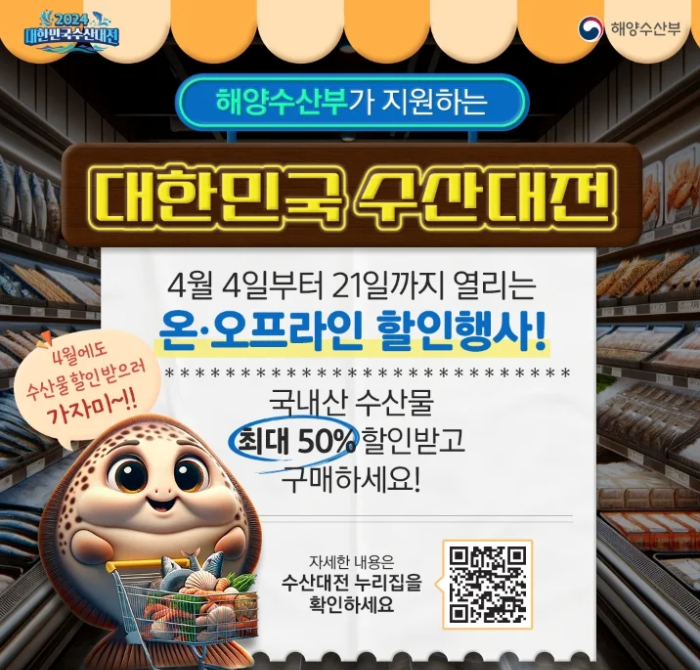 대한민국 수산대전이 수산인의 날을 기념하여 특별 할인행사를 진행하고 있습니다. 오는 4월 21일까지 이루어지고 있으니 많은 분들께서 수산인들의 특별할인 행사에 수산물을 저렴하게 구입하여 좋은 식자재를 맛있고 싸게 구입하시기 바랍니다.