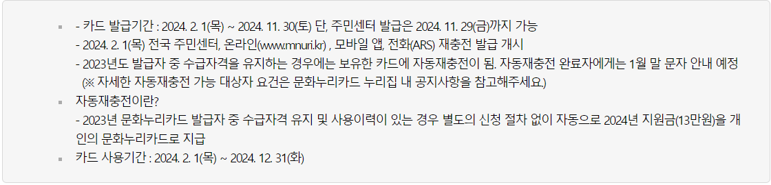 문화누리카드는 기초생활수급자 및 차상위계층등에 대해 13만 원을 지원해 주는 공공서비스 사업으로, 문화, 예술, 국내여행, 스포츠등의 기초 문화생활을 누릴 수 있도록 기프트카드 형태로 지급되는 카드입니다.
